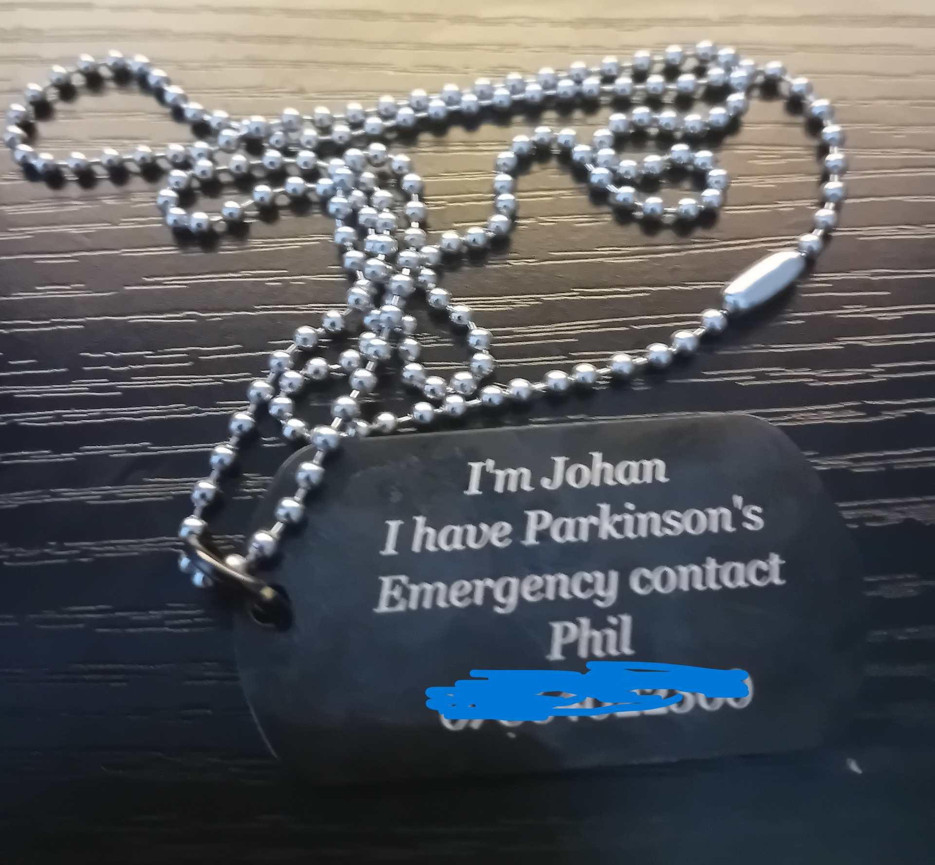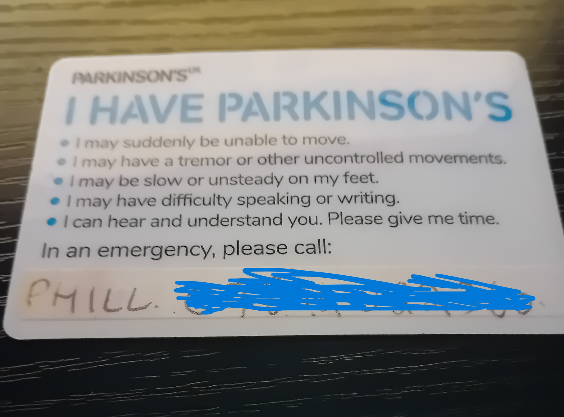 Always been a concern about what happens if I’m out in the city on my own and fall over. So I wear a dog tag and carry card from Parkinson’s UK in my wallet